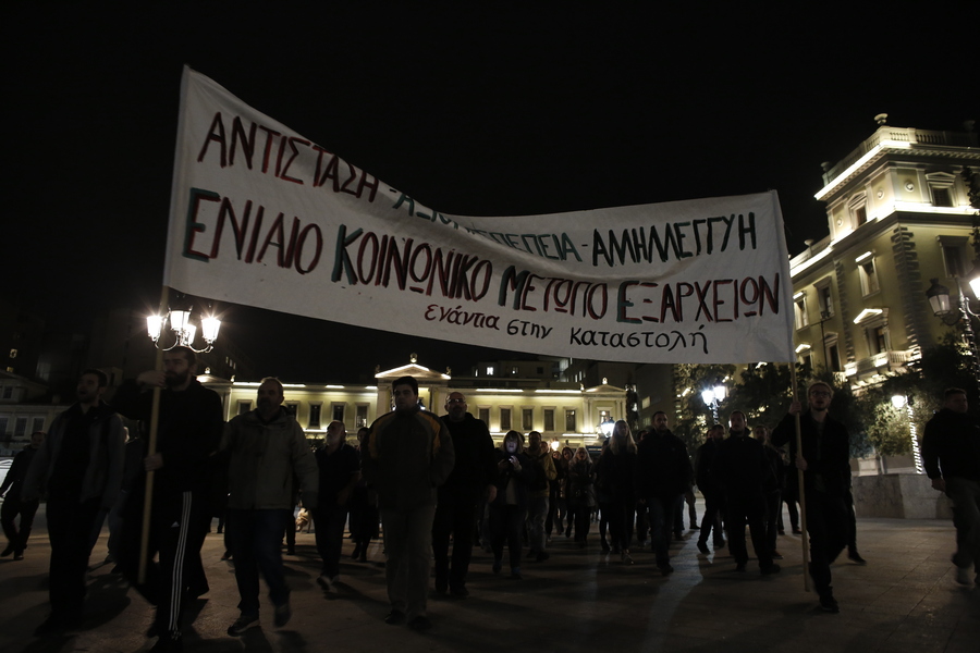 Συγκέντρωση διαμαρτυρίας που πραγματοποίησαν οι κάτοικοι των Εξαρχείων, και πορεία στο δημαρχείο της Αθήνας, ζητώντας «να σταματήσουν οι εκκενώσεις καταλήψεων, να φύγουν τα ΜΑΤ» και το φαινόμενο βραχυχρόνιων μισθώσεων, τύπου Airbnb, τη Δευτέρα 2 Δεκεμβρίου 2019. ΑΠΕ ΜΠΕ/ΑΠΕ ΜΠΕ/ΚΩΣΤΑΣ ΤΣΙΡΩΝΗΣ