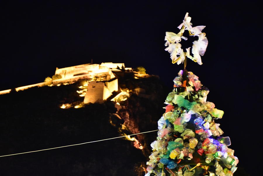 Χριστουγεννιάτικο δένδρο φτιαγμένο από ανακυκλώσιμα υλικά, τοποθετήθηκε στην πλατεία Ωνάση στο Ναύπλιο, την Κυριακή, στο πλαίσιο της καμπάνιας με τίτλο: «Θα το βρεις μπροστά σου», μια οικολογική δράση με χριστουγεννιάτικο δέντρο από ανακυκλώσιμα υλικά, χρήση του πλαστικού με την εθελοντική συμμετοχή των δημοτών και των παιδιών της πόλης. ΑΠΕ-ΜΠΕ/ΜΠΟΥΓΙΩΤΗΣ ΕΥΑΓΓΕΛΟΣ
